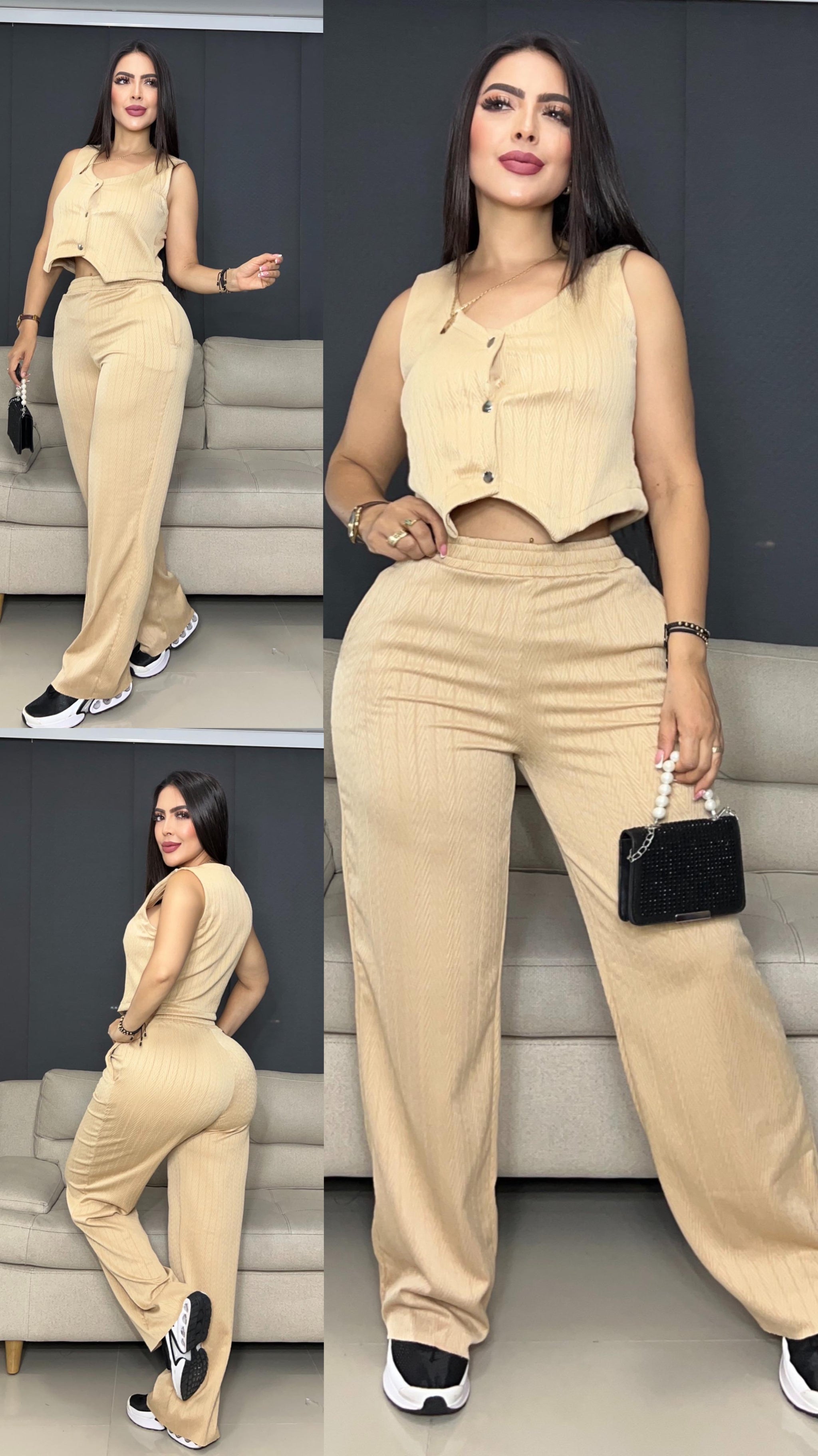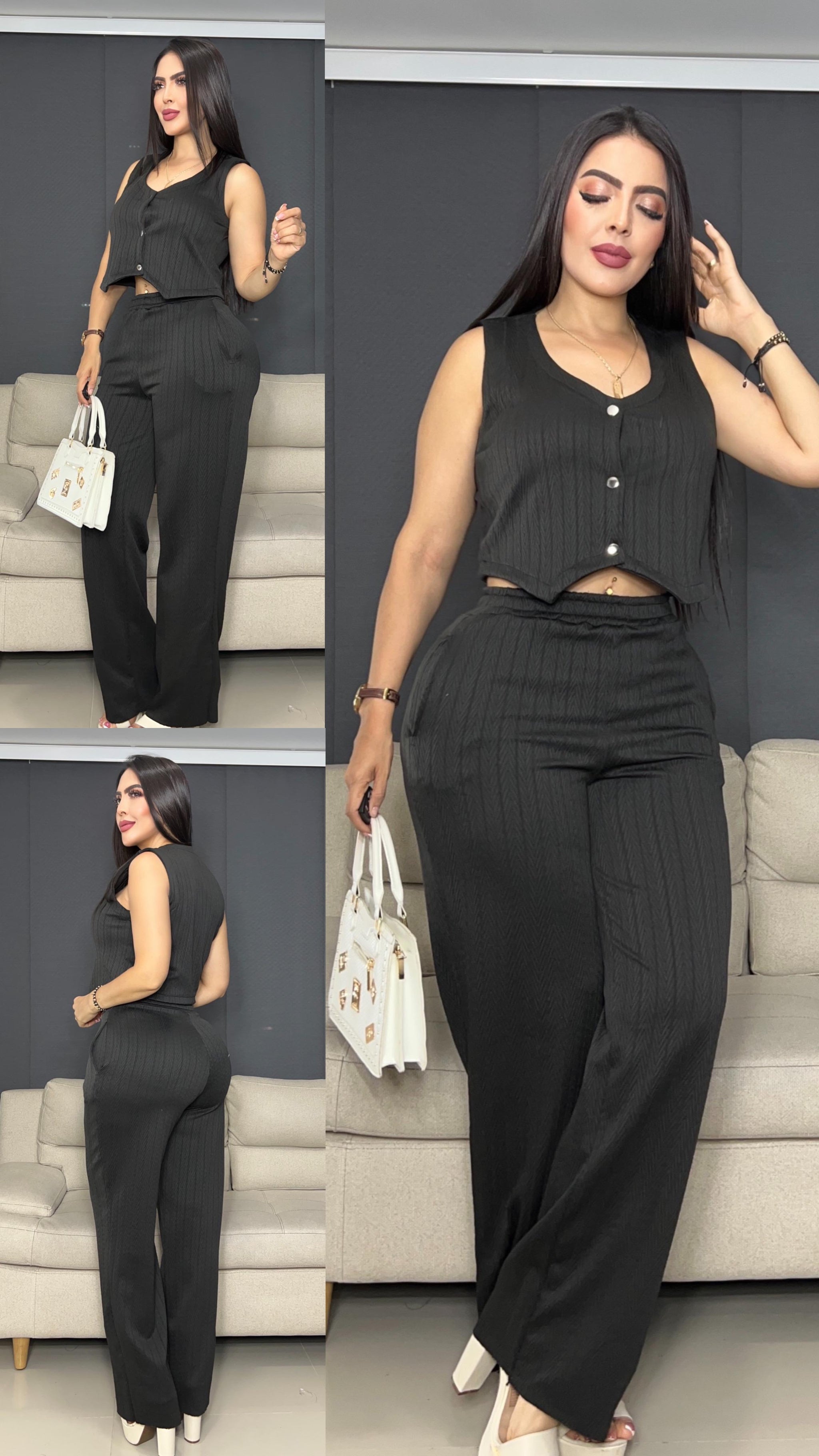 Elaborado en tela yackar licrada, este conjunto combina comodidad, frescura y ajuste perfecto. Su diseño tipo chaleco con detalles en flechas le aporta un toque sofisticado y actual, ideal para crear looks con personalidad.