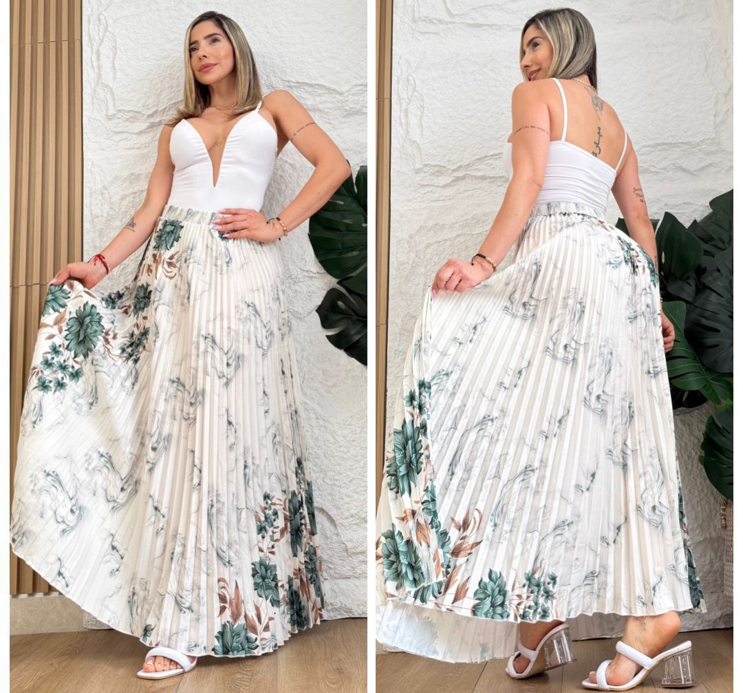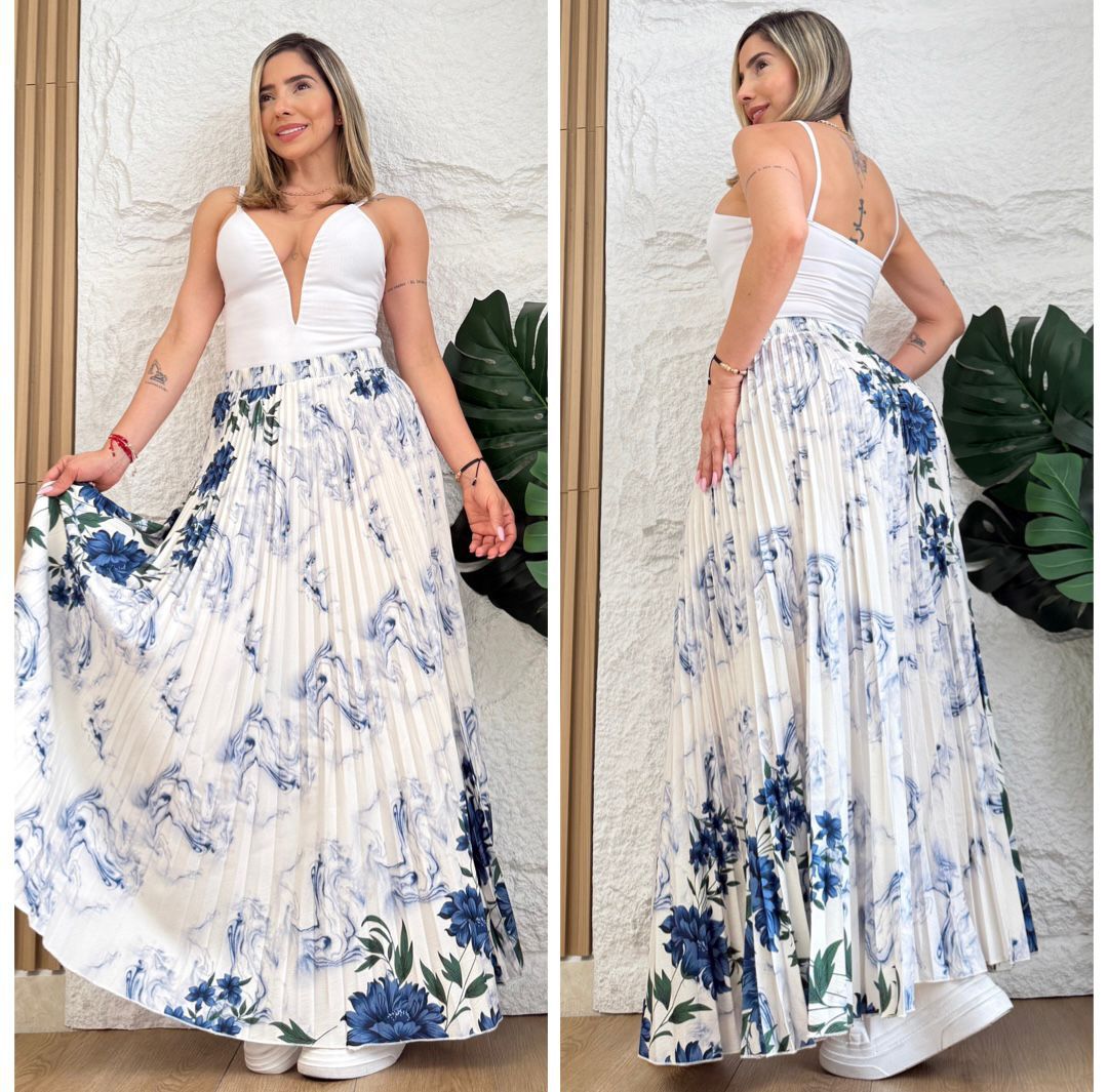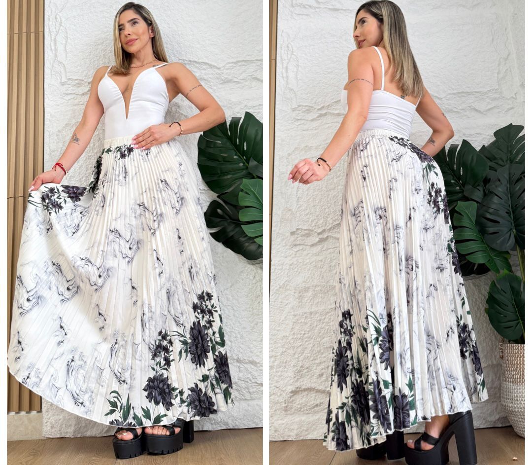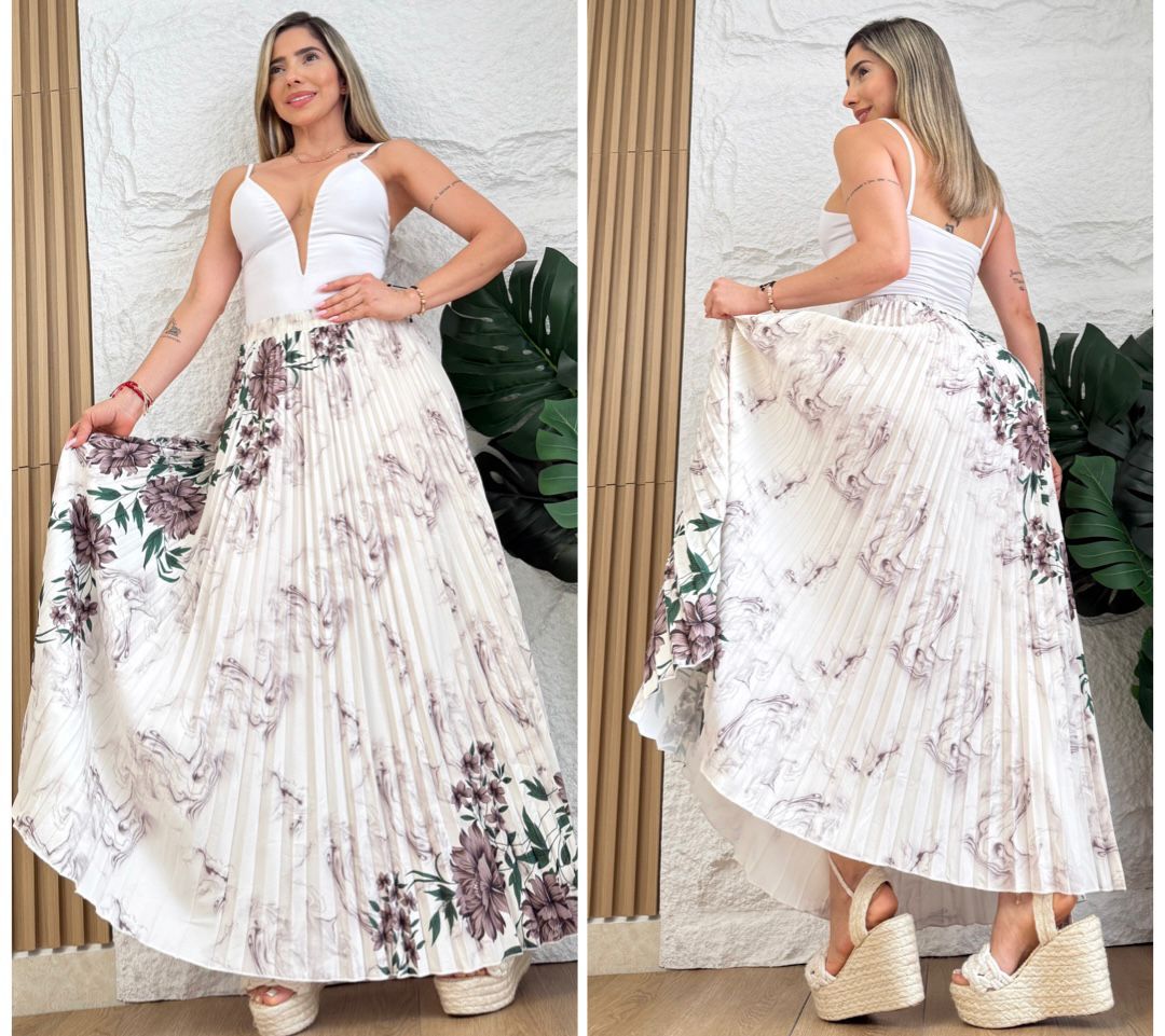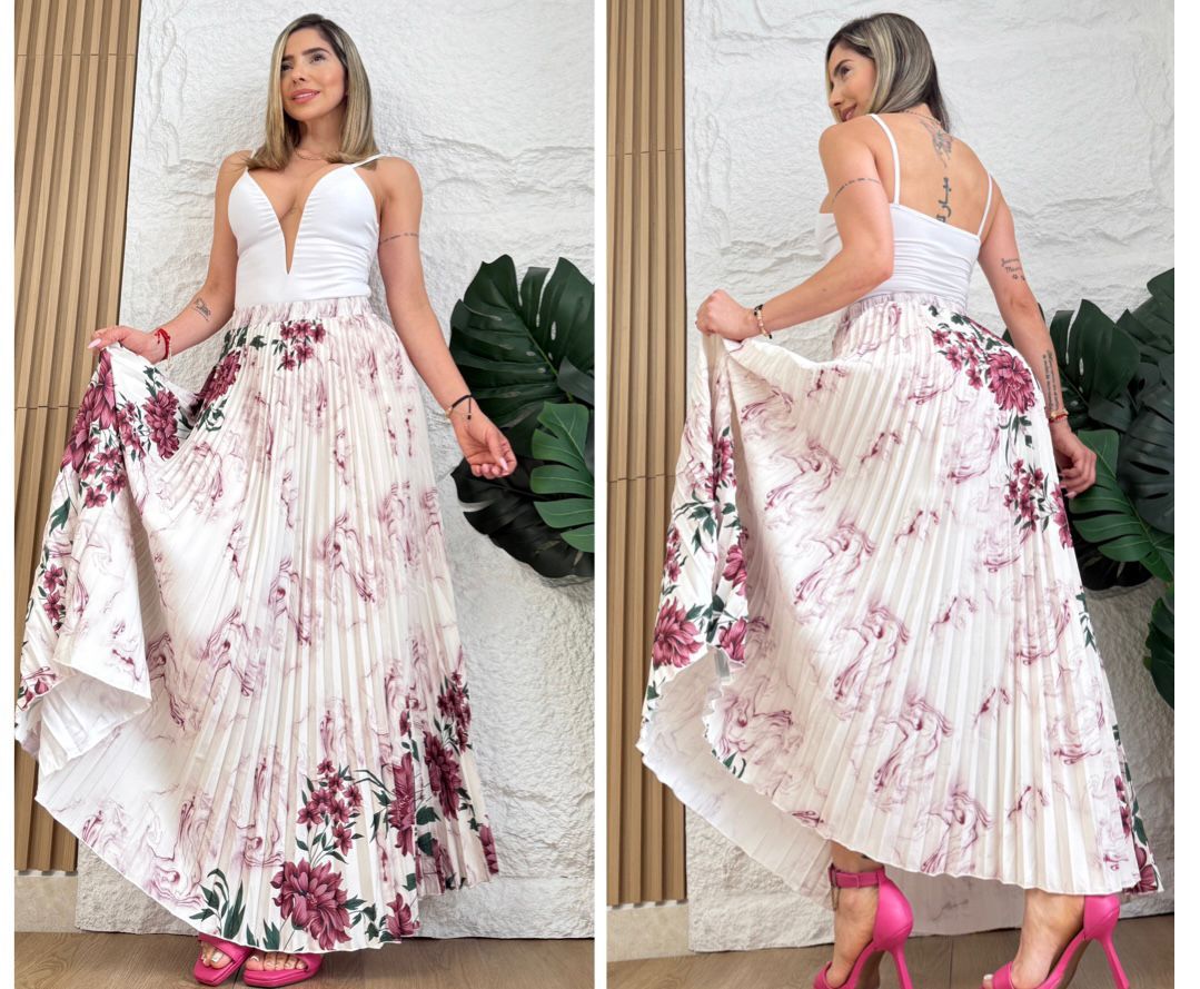 Falda larga plisada con caída fluida y ruedo amplio (rotonda) que estiliza cada paso. La pretina con resorte 360° abraza la cintura con comodidad y asegura un ajuste flexible para diferentes cuerpos. Liviana, versátil y fácil de combinar: úsala con tenis y camiseta para un look casual pulido o con sandalias/tacones y blusa para ocasiones especiales. No marca, mantiene la forma y ofrece movimiento elegante durante todo el día. Disponible en colores de temporada y tallas S, M y L.