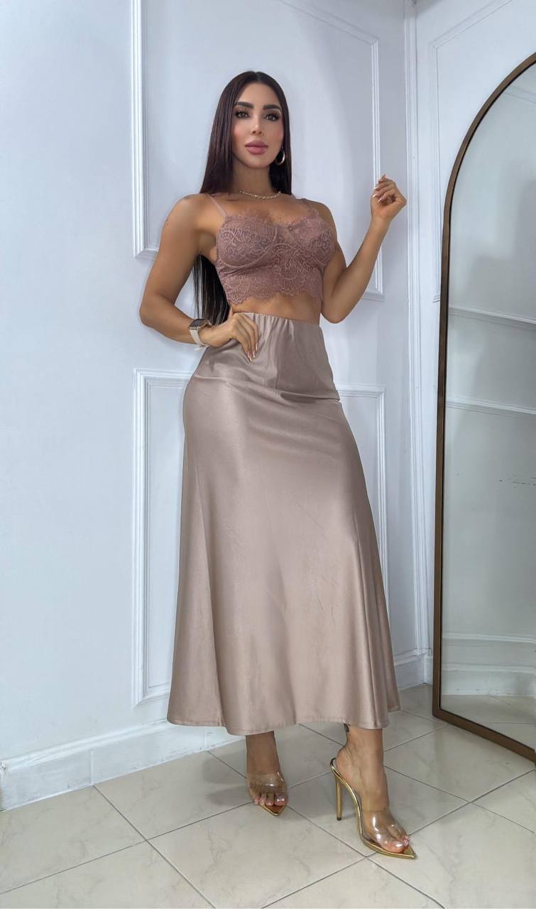 FALDA SATÍN EN LICRA ESPEJO — BRILLO QUE MOLDEA, ESTILO QUE CONQUISTA.