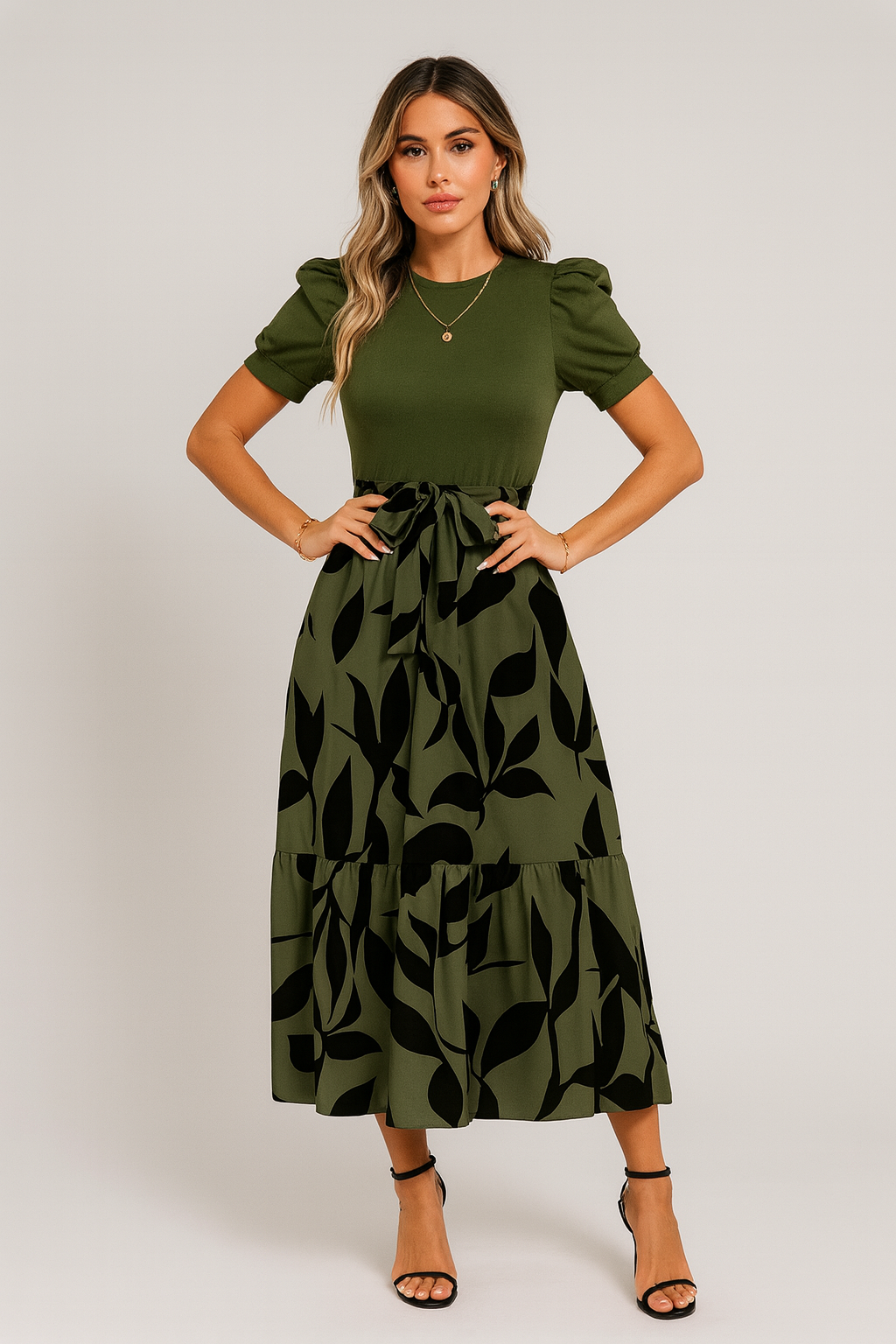 Un vestido midi en tela liviana con top liso y falda estampada de hojas, pensado para combinar comodidad y sofisticación. Las mangas abullonadas añaden un toque femenino, mientras el cinturón/lazo permite ajustar la cintura para un calce favorecedor. La falda con caída fluida y vuelo acompaña tus movimientos y funciona igual de bien con sandalias de tiras para eventos como con tenis para un chic urbano. No marca con la talla correcta y mantiene la forma durante el uso. Ideal para oficina creativa, almuerzos, paseos y noches casuales elegantes. Disponible en colores de temporada y tallas S–L.